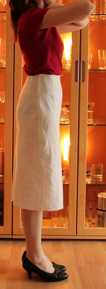 От этого юбка немного вздёргивается на крутизне правого бедра и переезжает чуть вправо. Это видно было на всех юбках, на этой тоже отлично видно (см. вид сзади и вид спереди).