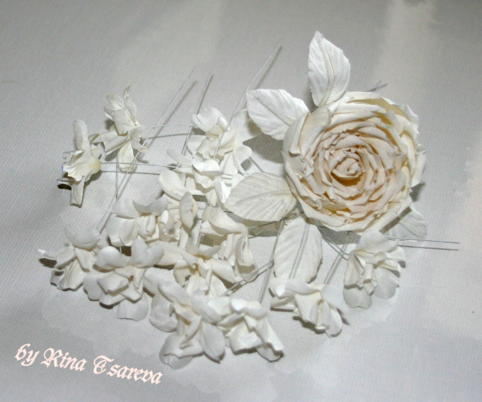 Рина_с Опубликовано 25 января, 2011 Поделиться #154 Опубликовано 25 января, 2011 Как много красивых цветов!Леночка-elegri, шляпка необыкновенно хороша! Тебе очень к лицу!Танечка, староанглийские розы мои любимые. Ваша - красавица, мне ооочень понравилась. Форма замечательная, чашечкой, крашение очень красивое и сборка грамотная.Надя, какие красивые ободки! Янтарная норка с дымчатыми топазами - суперкласс! Каллы - чудо. Жаль, что мелковата фотография, но даже так видно какая красивая и изящная композиция. А у меня все скромно. "Свадебный комплект" для украшения прически. Натуральный атлас, крашеный в белый цвет, т.к. заказывали молочно-белые. Ссылка на сообщение Поделиться на другие сайты Поделиться