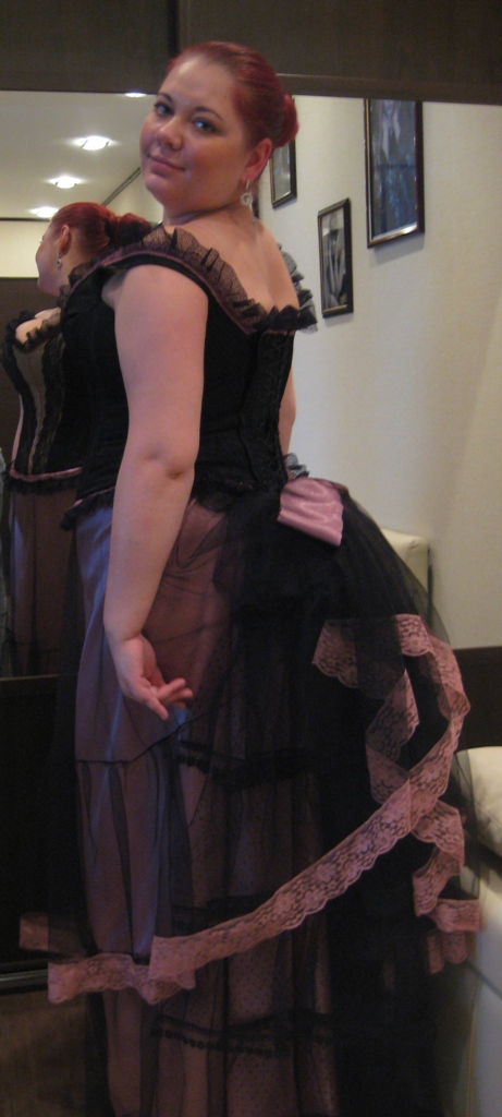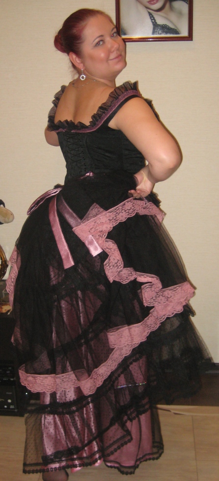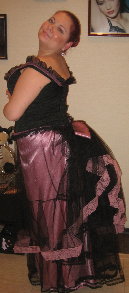 Dikiy Korov Опубликовано 10 сентября, 2012 Поделиться #43 Опубликовано 10 сентября, 2012 Уважаемые мастерицы, Появились более свежие фото. Юбка готова полностью, корсет в работе, нужно сделать рукава и закончить отделку тесьмой. Потом приступлю к навеске из черных бусин.Теперь подробнее о юбке: Главная задача была сделать ее максимально удобной в носке, а также, чтобы она легко снималась и одевалась. Соответственно никаких жестких конструкция типа кринолинов и «турнюрных подушечек» я делать не стала. Весь турнюр получился шиворот навыворот. Сама юбка состоит из четырех слоев и посажена на обычную резинку. Одевается и снимается через ноги. Линия посадки юбки – чуть выше талии, чтобы все технические части были полностью убраны под корсет. Нижний слой – розовый креп-сатин, сшит по принципу косоклинного сарафана. Прямое полотно, ширина которого равна обхвату бедер, сзади расширяется при помощи четырех прямоугольных клиньев. Нижняя кромка обработана косой бейкой, верхняя загнута кулиской, в которую потом вставляется резинка. К нижней розовой юбке пришита спереди оборка из мягкой черной сетки, отделанная кружевом.Дальше идут два слоя, которые я назвала «попка» и «хвост». Хвост – кусок жесткой черной сетки 1х1 м. Низ обработан кружевом, на него нашиты 5 оборок из четной сетки в мушку с коэффициентом 2. Оборки также все обработаны черным кружевом. Нижняя оборка хвоста нашита так, чтобы выходить за основное полотно, верхняя кромка хвоста максимально собрана на нитку. Попка – небольшой кусок черного крэп-сатина, на который также настрочены оборки из жесткой сетки, все крепко собрано на нитку. Попка по сути – вариация турнюрной подушечки и крепится под хвост для придания еще большей приподнятости. Верхний слой – юбка «бомба» из мягкой черной, только она без кокетки. Оборка чуть длиннее, чем в статье, отделка – розовое кружево. Петли и пуговку пришивать не стала. Просто пришила верхний слой и зафиксировала боковые швы в нужном месте. Бант – двухслойный из розового крэп-сатина и мягкой черной сетки. В середине – брошь камея. В кулиске юбки двойная резинка. Снимать и одевать ее очень удобно, только после одевания надо долго расправлять хвост, и разглаживать складки спереди.Про корсет напишу подробно, когда будет готов окончательно. Жду от Вас комментарии и здоровую критику. Ссылка на сообщение Поделиться на другие сайты Поделиться