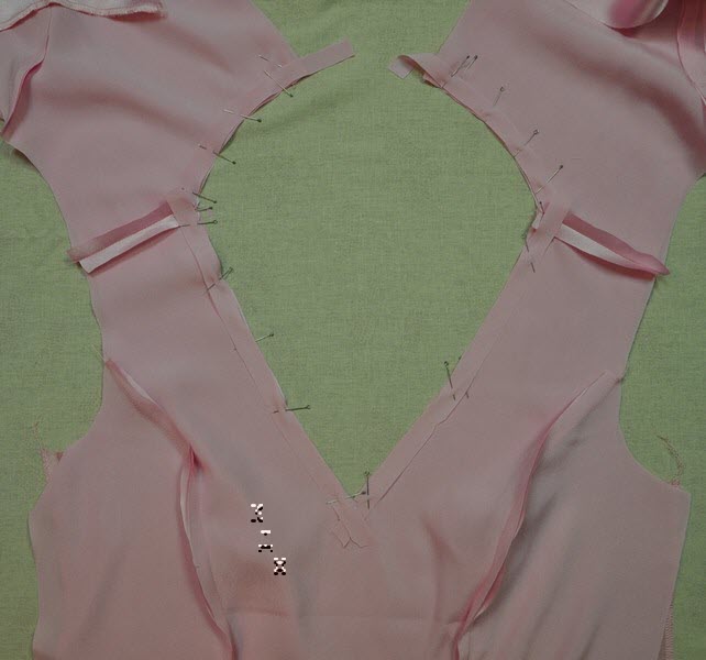 Верх платья обтачан подкладом из основной ткани до пояса с тем, чтобы, если захочется носить розовое платье самостоятельно, можно было бы поддеть лишь нижнюю юбку.