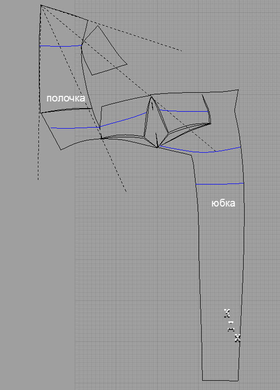 Если посмотреть на эту схему, то видно, что полочка вверху образует угол, напоминающий косынку или салфетку. Путем складывания салфетки находим нужные формы и подрезы. Я то все делала на виртуальном манекене, но думаю, что этот узел можно делать макетированием.
