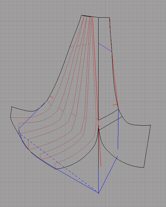 Отмасштабировала всю конструкцию с коэффициентом 0,95 (можно было и 0,92-93), развернула, внесла некоторые корректировки, дала припуски на швы.