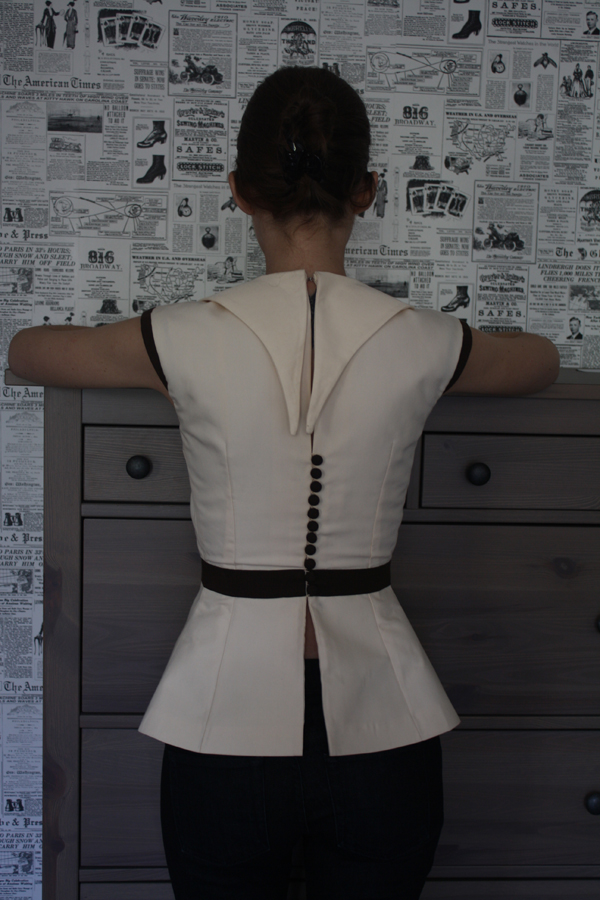 Жилет потому, что те 2 человека, которые видели эту вещь, не сговариваясь назвали ее именно так. То что на груди крепится на пуговку, это не декоративная деталь, а воротник. Он продублирован клевой тканью (кажется так это назвали в маназине). Идея воротника из головы, небольшой объем низа захотелось сделать после выставки Диора. Внизу та же клеевая ткань для формы. Спинка выглядит примерно так.