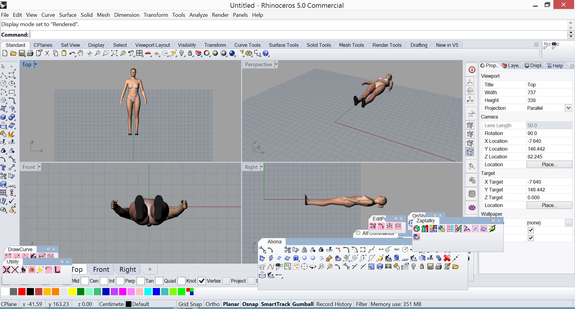 Импортирую в Рино. Открывается "лежачим". На боковом виде разворачиваю в вертикальное положение и перемещаю на нулевую точку координат. Удаляю все, что мне не надо. В финале экспортирую в формате obj. Все, манекен готов для загрузки в качестве аватра в Кло