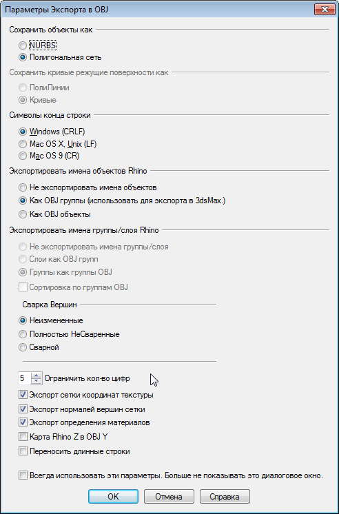 Покажу какие галочки я выставлял при экспорте пуговицы из Рино: