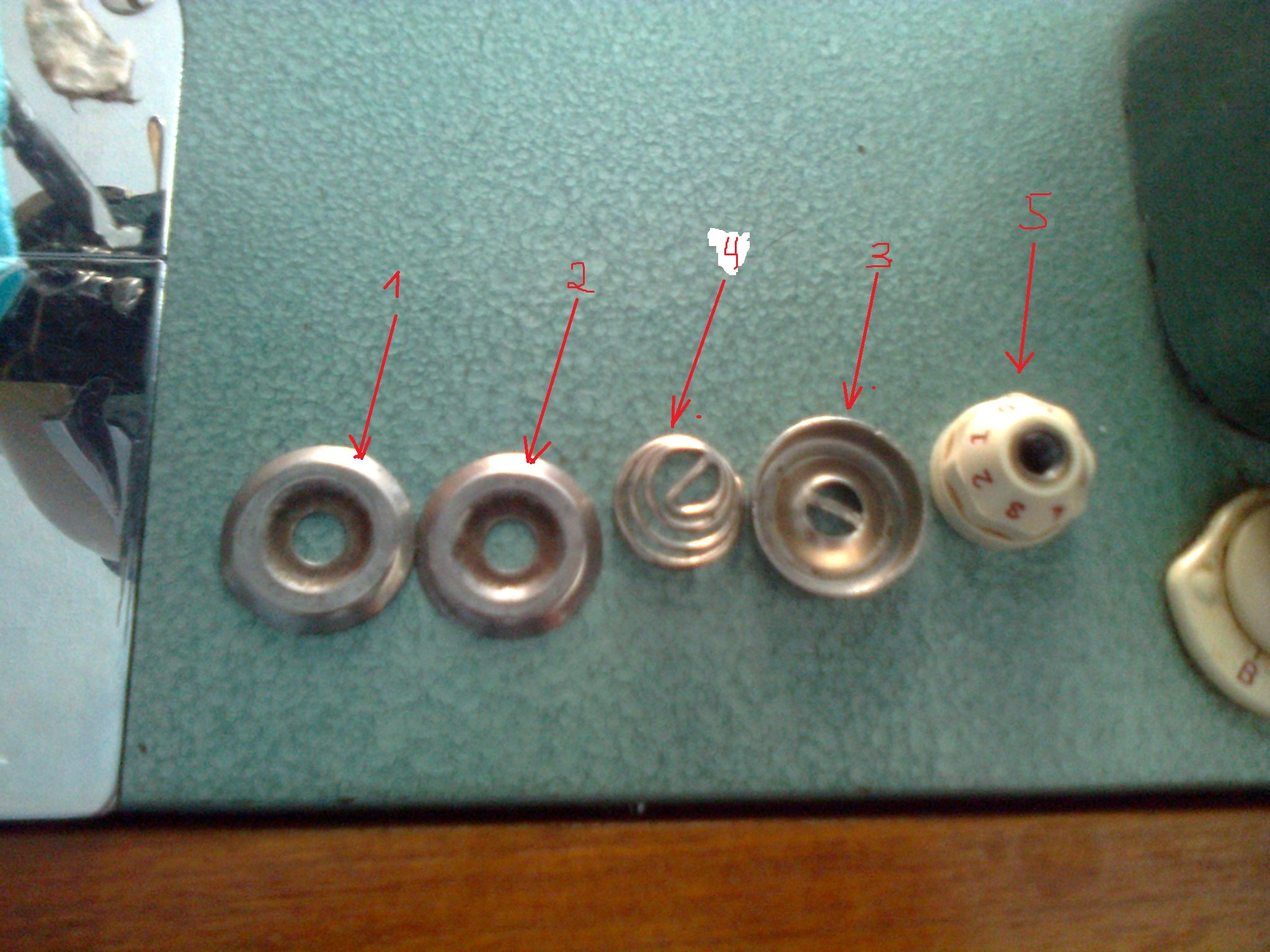 У регулятора есть ещё одна важная деталь - такой слегка согнутый штырёк диаметром со спичку, длиной сантиметров 4-5. Он влияет на "разжимание" тарелочек при подъёме лапки. иногда его теряют, забывают вставить или вставляют неправильно. Тогда тарелочки или вообще не зажимаются (и натяжения нет совсем), или всегда в зажатом состоянии (и натяжение не регулируется).