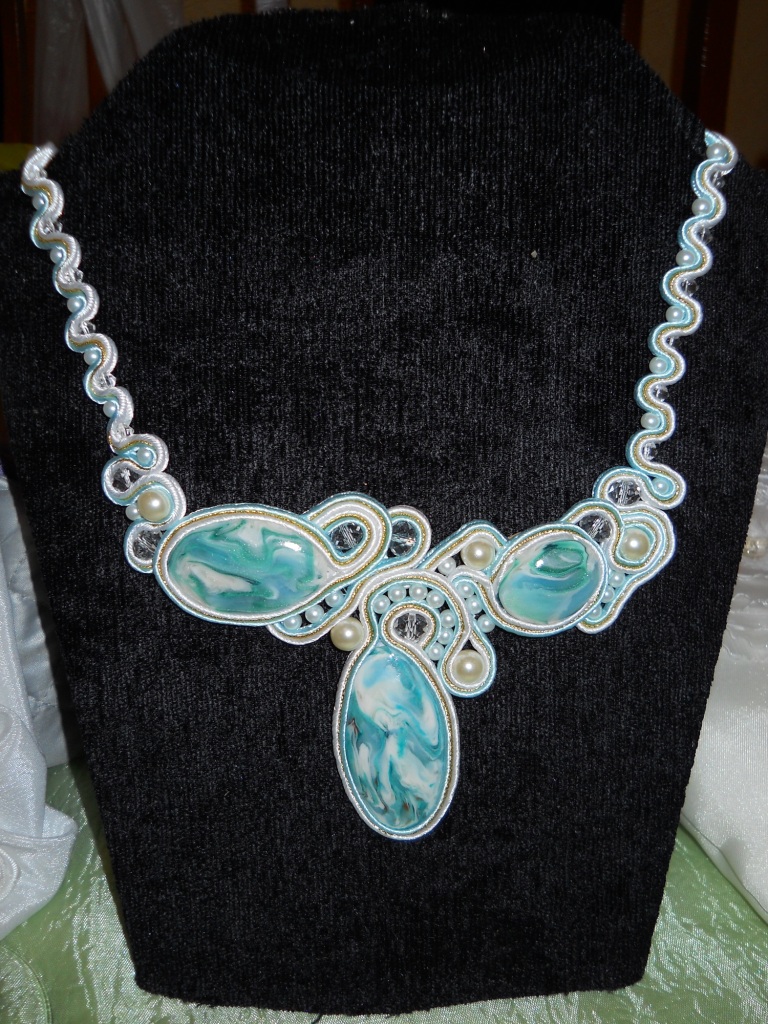 А у меня уже "Первый снег". Фотала на бегу уже, колье уехало к счастливой обладательнице(вид колье для неё сюрприз). Кабошоны - полимерная глина.