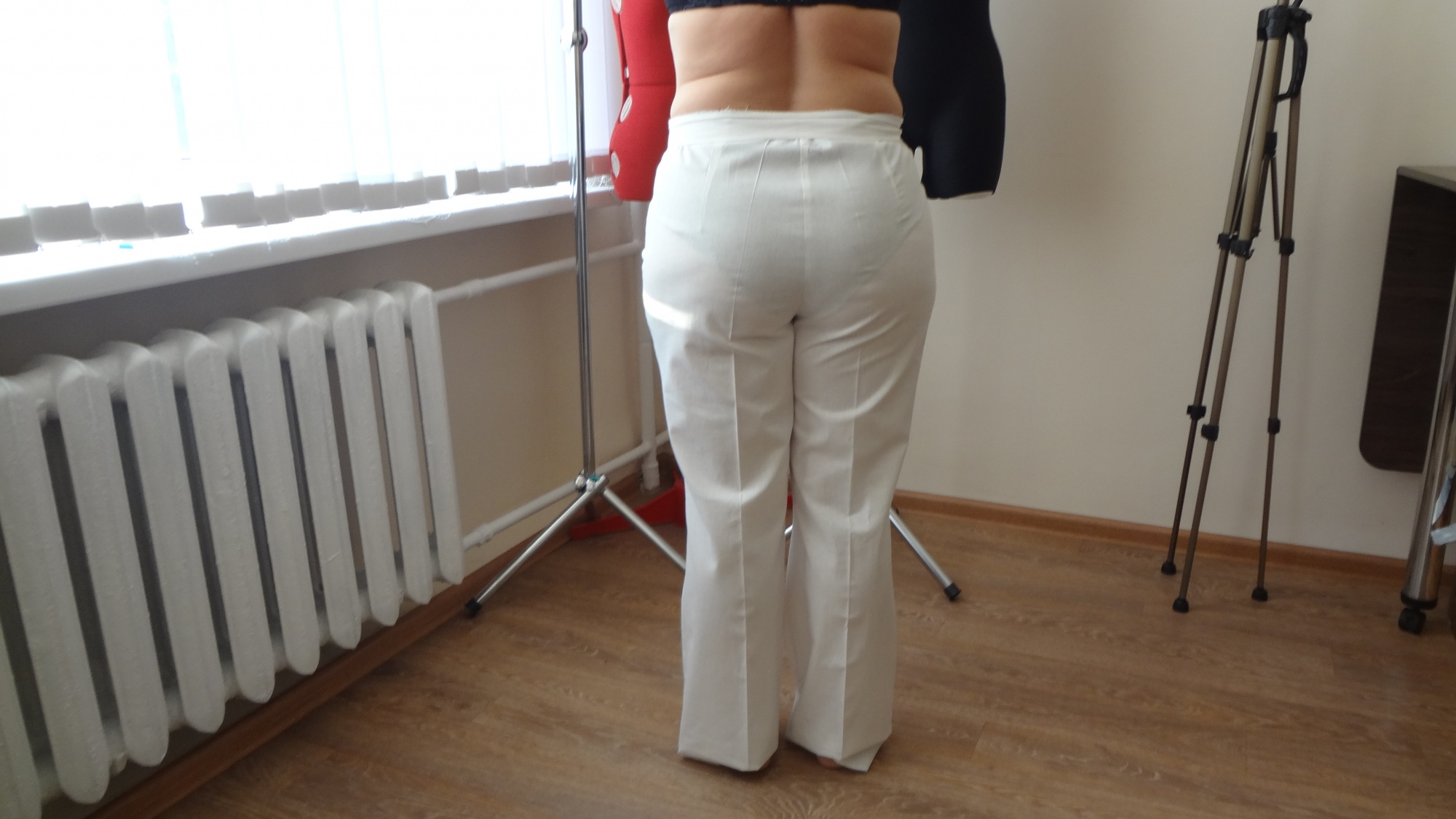 O'Lesya Опубликовано 13 декабря, 2018 Поделиться #1448 Опубликовано 13 декабря, 2018 (изменено) Вот что у нас получилось после внесения изменений. Это пробник из плотной бязи. Ткань заказчика плотная, стрейч. Те см, что я добавила в бёдра, они оказались лишними, их заколола. Сзади заломчики остались, но выглядит поприличнее чем первый. Спереди лучики тоже есть, но в действительности они не так остро смотрятся как на фото. Клиентка этим довольна, говорит, что так хорошо на ней ни одни брюки не сидели. Но мы же видим, что их надо ещё "дорабатывать". Хочется добиться идеального исполненияМожет сделать ещё на 1-2 см пошире задний клин, а в боковом шве убрать Изменено 13 декабря, 2018 пользователем O'Lesya Ссылка на сообщение Поделиться на другие сайты Поделиться
