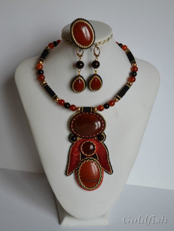 И два бисерных кулончика: "Русский сувенир" и "Красный цветок", объединенных темой "Огня, еще огня!" и в комплект - серьги и кольцо