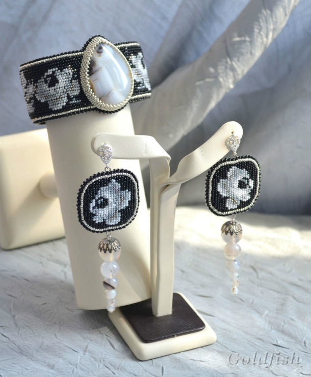 Комплект "Черно-белое танго" - колье, браслет и серьги.