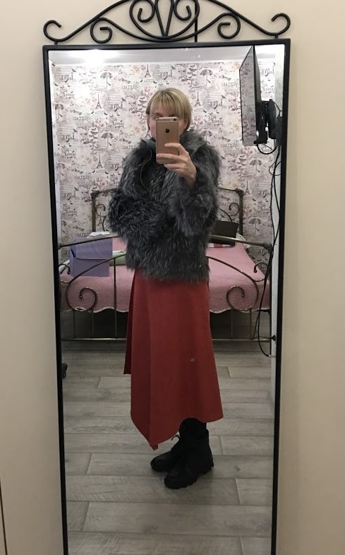 Вот как раз и означает(. Носить планировала зимой с ботиночками и меховой курткой. Но и ботинки оказались сюда тяжеловаты,разве что до весны отложить,там есть обувь более деликатная. Про туфли,конечно,разговор не идёт,ткань скорее для зимы-начало весны. С сапогами зимними попыталась сегодня сделать фото. За селфи сильно извиняюсь,так и не научилась себя в зеркале снимать. Какой то громоздкий "низ" вышел,может надо было покороче делать,или больше на основе прямой юбки ,хотя я клешение по бокам убирала и на стадии пробника,и ещё немного уже на примерке из основной ткани.