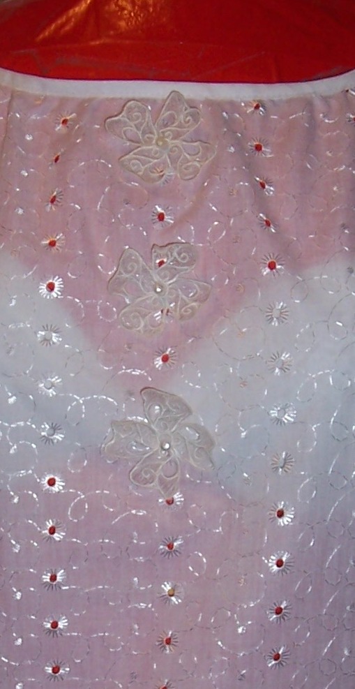 с вышивкой было так, старалась подобрать все в цвет ткани - она сама по себе очень тоненькая и нежная, нитки вроде в тон, а начала вышивать на пленке все показалось желтоватым, поэтому вышила спинку, сполоснула и вздохнула спокойно - доделала рукава)