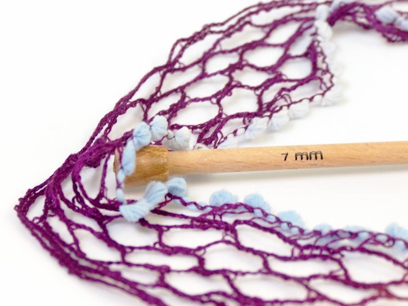 Если ваш лохматенький шарфик вязать на спицах, то рюши будут вкруговую. Но можно вязать и на грабельках, тогда рюши будут только с одной стороны