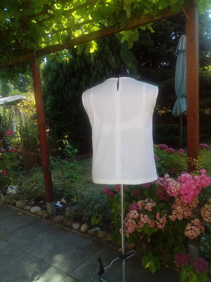 Моя спинка — цельнокройная, без среднего шва и застежки. Горловину я расширяла, но не из-за отсутствия застежки — голова проходит и так, просто мне больше подходит более широкий вырез. От обтачки решила отказаться, горловина обработана кособейкой.