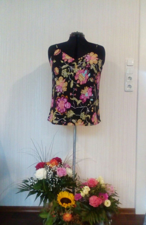 Это достаточно плотный креп, топ выкроен по косой и выгулян в отпуске с чёрными лёгкими вискозеыми брючками а-ля треники. Да и по осени он неплохо разбавляет строгий брючно-пиджачный костюм.