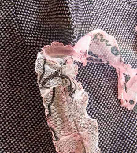 Этот костюм сшит из чистой шерсти, необыкновенно приятной во всех отношениях, ткань именная. Переплетение рогожистое, нити чёрная и сиреневая-тёмная, что даёт эффект серого цвета. К нему подобран тюль, в холодно-розовых тонах.