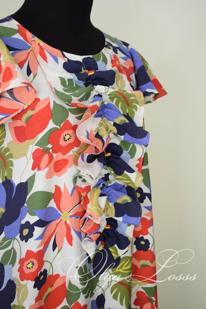 Платье расклешенное к низу (нагрудная вытачка переведена вниз). Длина плеча укорочена на 3 см и рукавчики-крылышки.