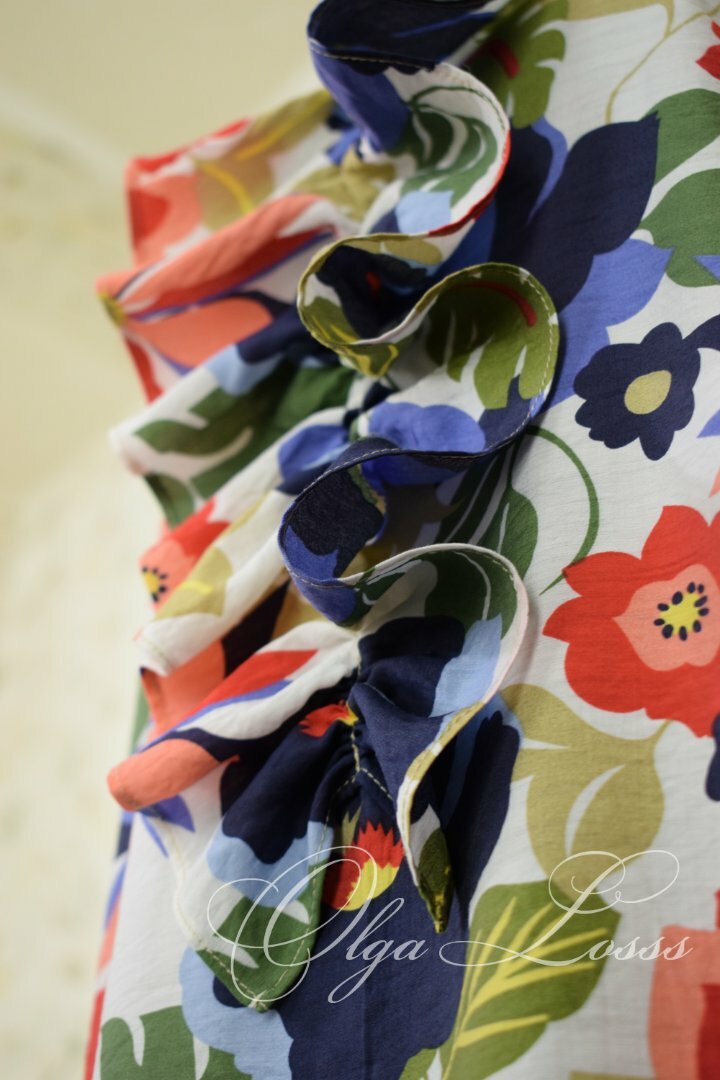Жабо - это практически прямая полоса ткани, слегка заужена к низу по ширине. Коэффициент сборки 2:1. Все срезы обработаны узким московским швом. Верхняя часть жабо входит в горловину.