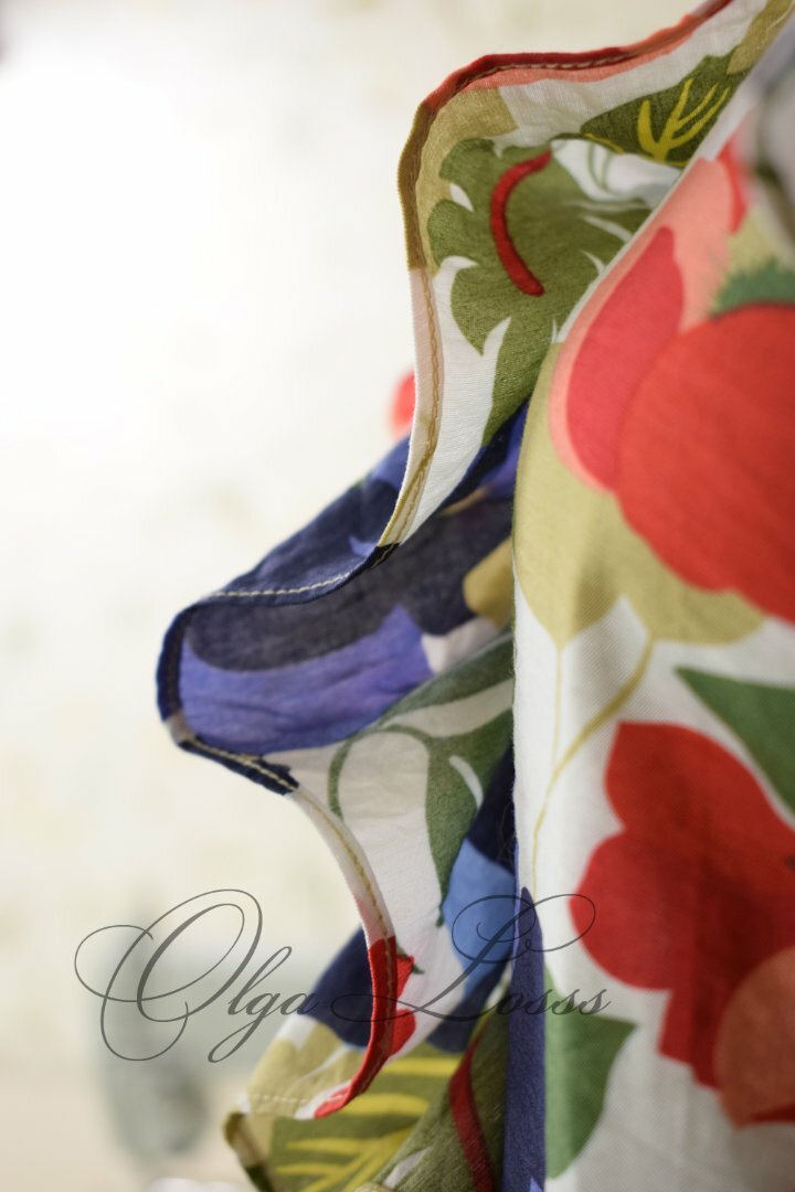 Это шорты с блузкой. Тканюшка точно такая же, как красная вставка на платье "Снегирь". Это какая-то смесовая ткань. Хлопок с синтетикой. Но синтетики мало. По фактуре очень она похожа на лен, рябенькая такая. И главное украшение костюма, конечно, стрекоза! Это аппликация. У меня был остаток батиста с фантазийным рисунком в огромные цветы. Вот из него я и вырезала стрекозу. Старалась подобрать участок ткани так, чтобы прожилки с цветка попали на крылышки и создавали впечатление перепонок на крыльях, как у настоящей стрекозы.