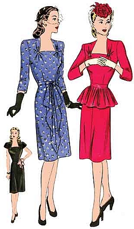 Мода начала 40-х годов была практически продолжением моды конца 30-х. Единственное что изменилось в силуэте - это длина юбок и платьев. Она стала короче, т.е. где-то за колено как следствие введения ограничения на расход ткани в военных нуждах. Ограничения касались также количества пуговиц, манжет и размера бортов. Особенно жёсткие ограничения были в Англии, которые были отменены только в 1949 году.