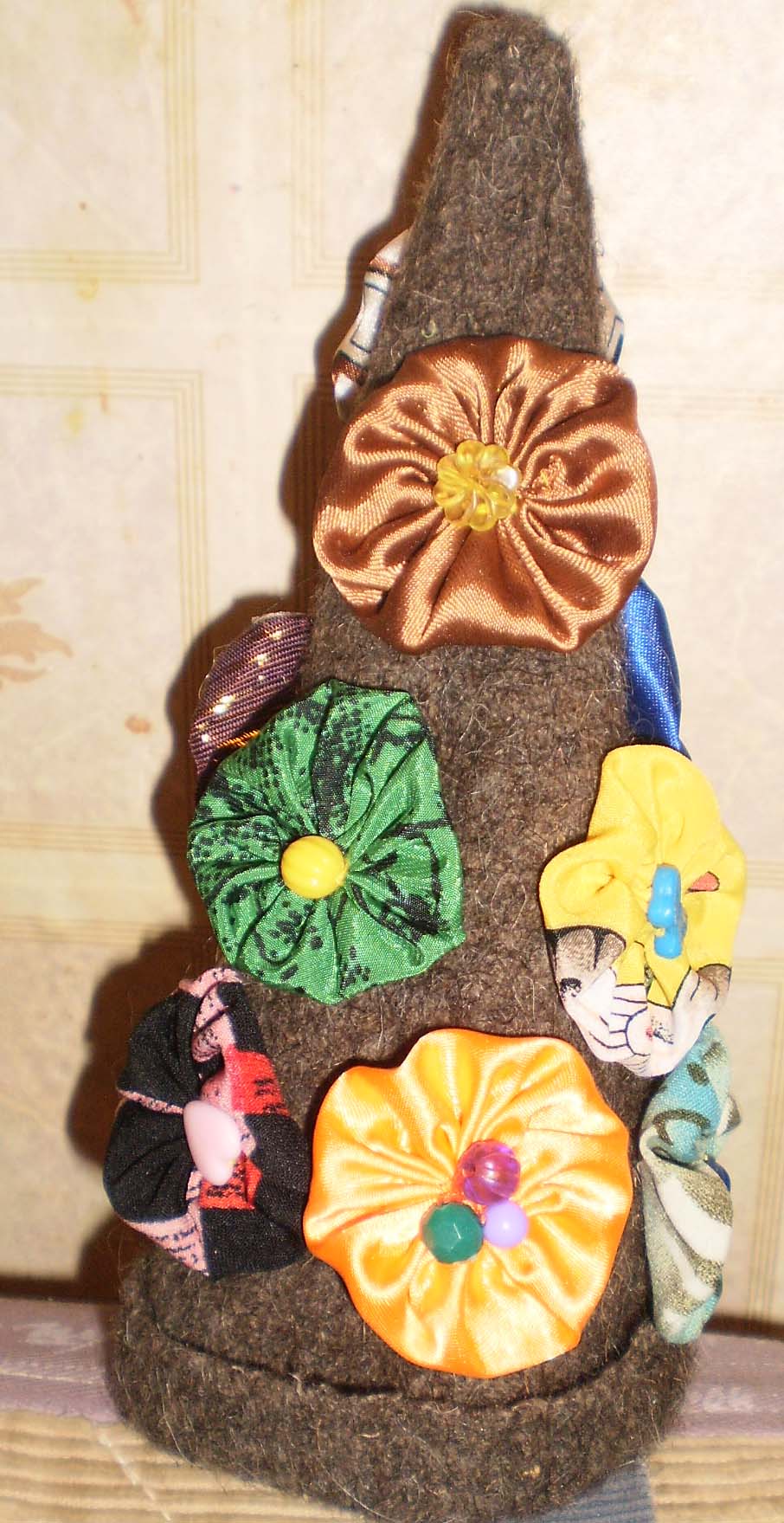 3) Треугольники накладываем друг на друга и сворачиваем в произвольные "трубочки". Затем с помощью клеевого пистолета терпеливо ряд за рядом "одеваем" свою Елочку.