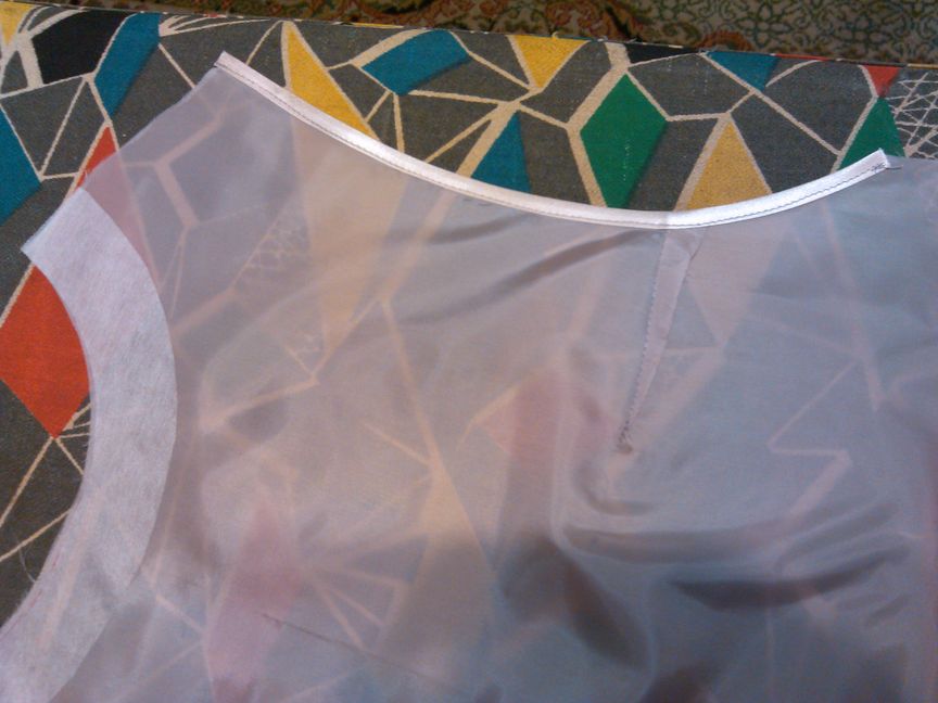 Ира, там в описании горловина обтачена подкладкой. Не бейкой, а всего платья. Мне результат не понравился, поэтому я добавила стойку (по косой), а подкладка прикреплена только по плечевым швам.