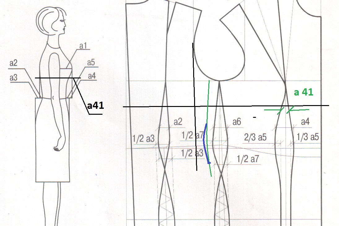 по окончании построения потом уже будет откорректирована линия бока в связи с дополнительным углублением(если надо, вот тут нам понадобится мерка высота нижнего края ребра ) теперь смотрите расстояние x еще больше уменьшится, поэтому углубленным раствором а21 можно пренебречь-мы его отправляем принудительно в бок шов в утяжку и рассчитывать его дополнительно не нужно