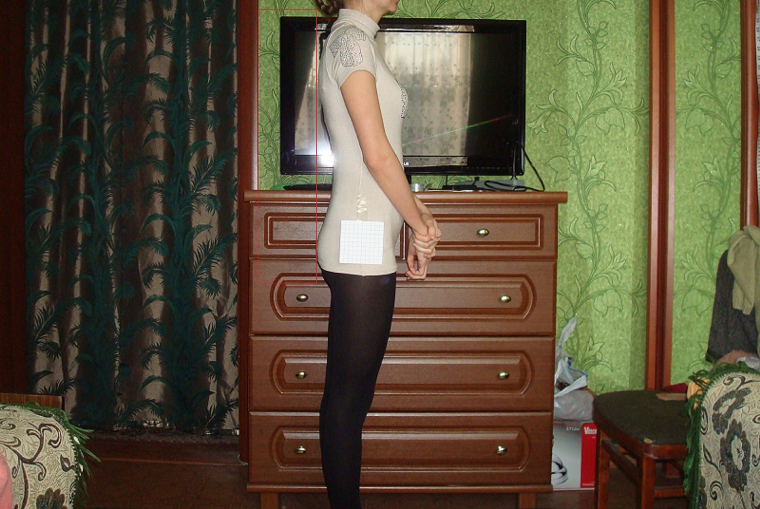 Павелина, еще хотела спросить по поводу фигуры.У меня перегибистая фигура? Вот сделала более-менее адекватное фото в профиль, выступ ягодиц относительно лопаток где-то до 0,5-0,6см, а положение корпуса, еслия я правильно его отметила на фото и правильно измерила относительно листка - 4,7-4,8-4,9см (в реале на фигуре очень тяжело измерить эту величину), расстояние от вертикали до линии талии - около 4,2см по горизонтали(отметила на фото красными линиями). Мне надо как-то учитывать этот выгиб спины после построения средней линии спинки? Там по Мюллеру я делала стандартный им предлагаемый отвод, нужно ли корректировать средний шов, исходя из этих факторов?
