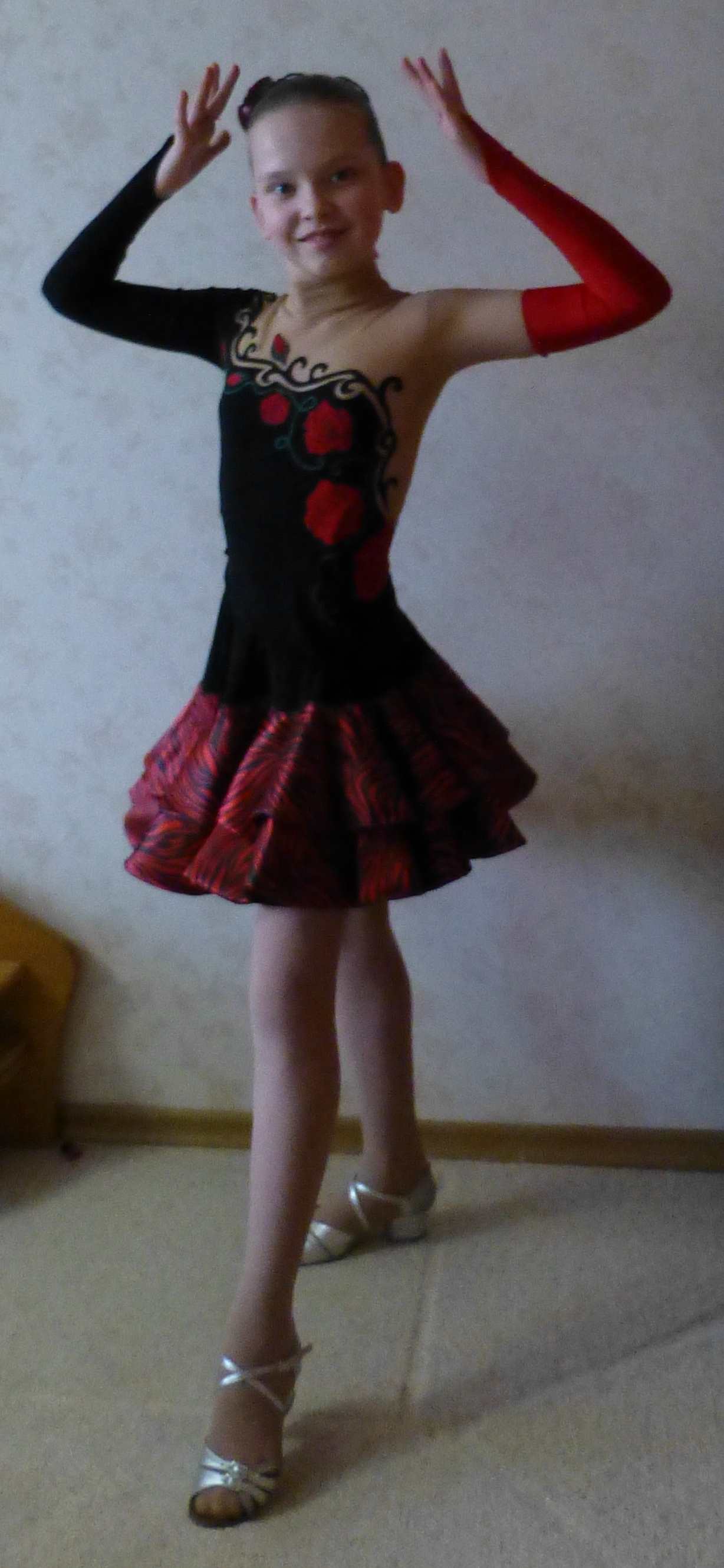 Прошу прощения, но просто выскажу свое впечатление. В латине просится более яркое пятно на юбке, возможно, волан ярко-красный, как рукав или полоса по краю воланов ярко-красная. Вот лично мне не хватает в юбке яркости, черно-красный принт смотрится как бордо,то есть краски сливаются из-за мелкого рисунка, и красный рукав сильно бьет в глаз своей яркостью. Можно пришить ярко-красный кринолин с бейкой, но юбку надо "развеселить" красненьким)))