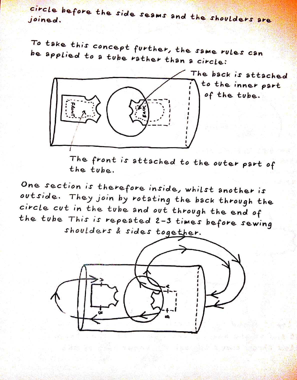 Lucy Опубликовано 2 февраля, 2012 Автор Поделиться #18 Опубликовано 2 февраля, 2012 (изменено) Добрый вечер всем. В своей брошюре Substraction Cutting School (всего 63 стр.) Джулиан Робертс представил три техники. Первая - это туннельная ( основа -труба, на ней рисуется полочка и спинка). Вторая- Plug technique, при которой на ткани вырезается линия произвольной формы, в нее вшивается вставка, как правило, правильной формы с таким же периметром, как и произвольная линия. С помощью этого создается дополнительный объем и форма. Третья техника - Displacement, то есть перестановка, смещение деталей выкройки, это когда детали проворачиваются вокруг круга несколько раз (1-3 раза) . Meriley разместила сканы с этими техниками несколькими постами выше. Эта футболка построена на основе третьей техники, то есть нужно, по-видимому, ее как-то крутить. Снова пробовала, не выходит. Изменено 2 февраля, 2012 пользователем Lucy Ссылка на сообщение Поделиться на другие сайты Поделиться