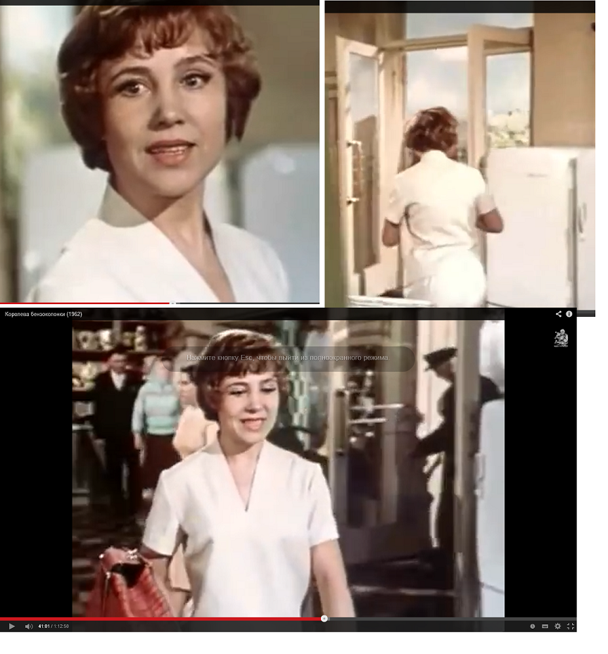 главная героиня в м агазине "Королева бензоколонки", и эпизод стильная женщина с зонтиком вечером "А я шагая по москве".