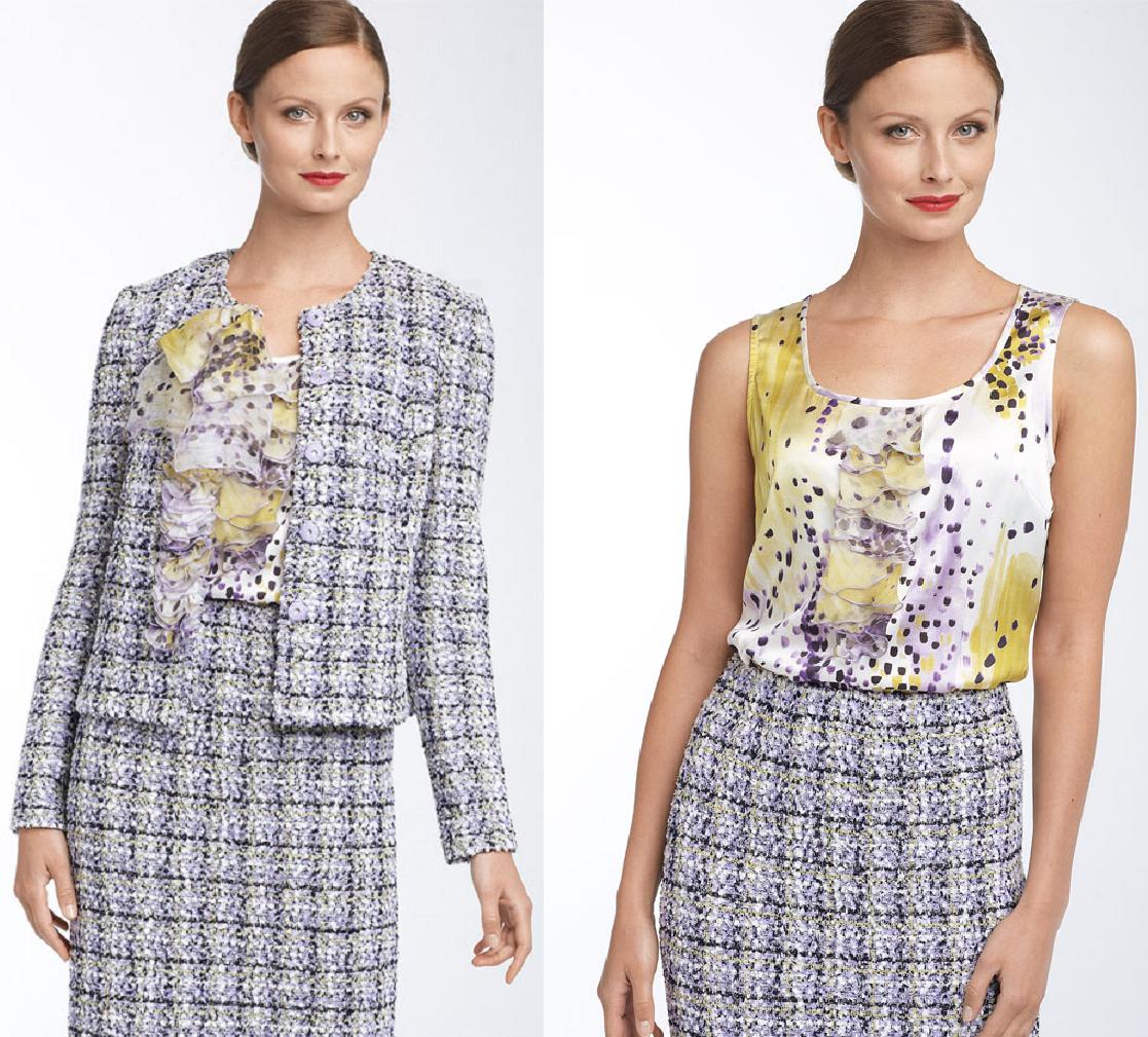 Holya, нужно пробовать. Может быть, сделать несколько небольших образцов, а потом приложить к шанельной ткани и тканям блузок и посмотреть какой из вариантов будет смотреться лучше всего со всеми тканями.