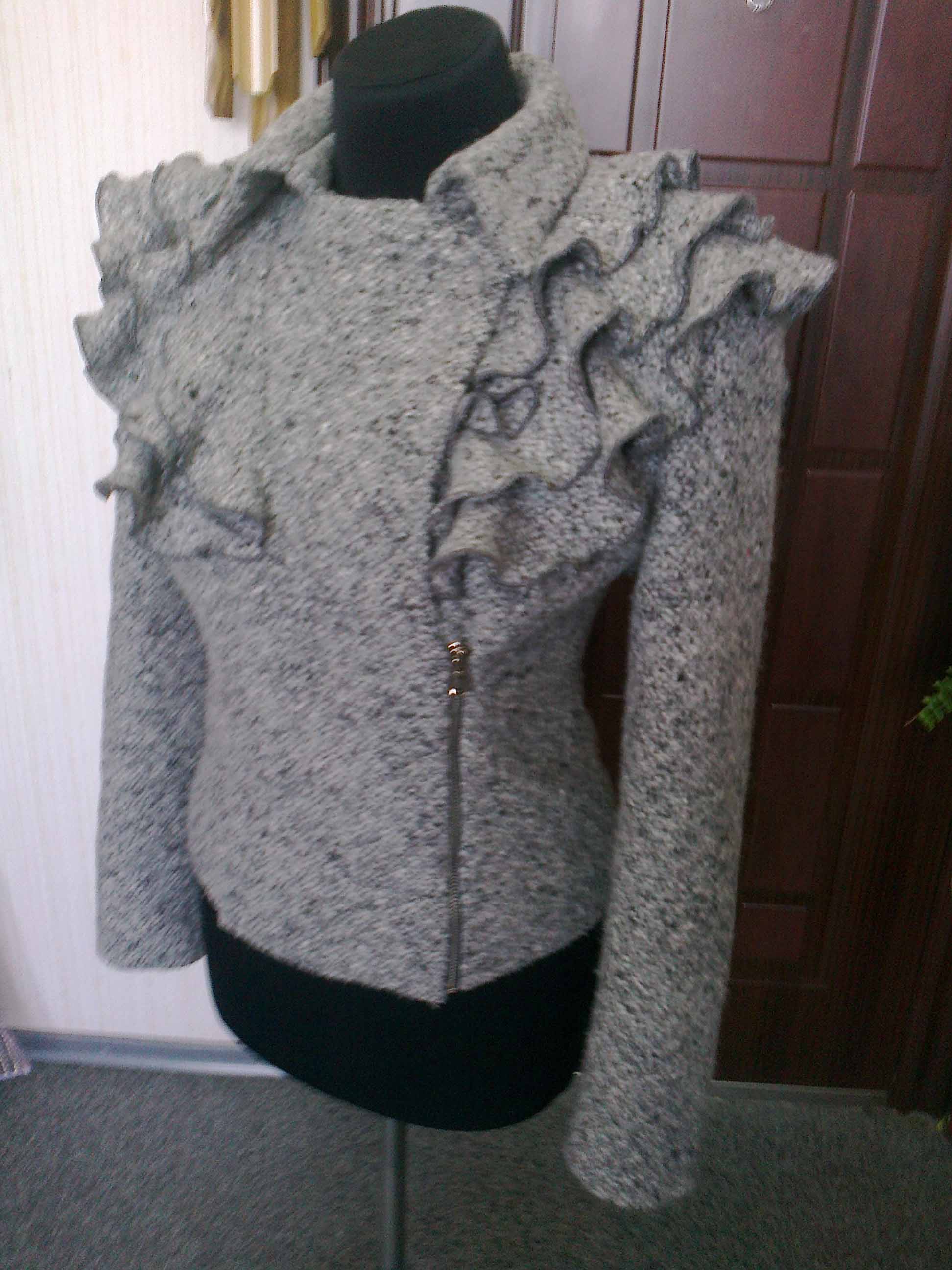 Куртка необычная по отделке, воланы придают воздушность и легкость модели.