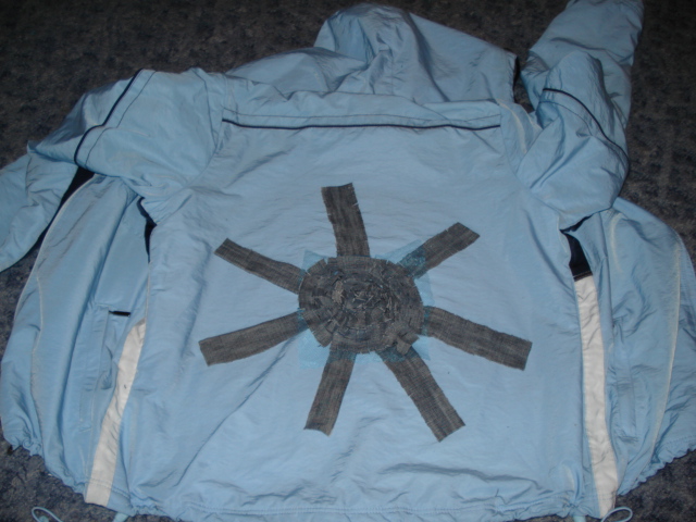 Натали, а может обратите внимание на вышивку? Солнышко из джинсы, имхо, смотрится грубоватым - и по форме, и по цвету на таком нежно голубом. Да и разность фактур (тонкая плащевка - грубая джинса) после обработки будет видна.