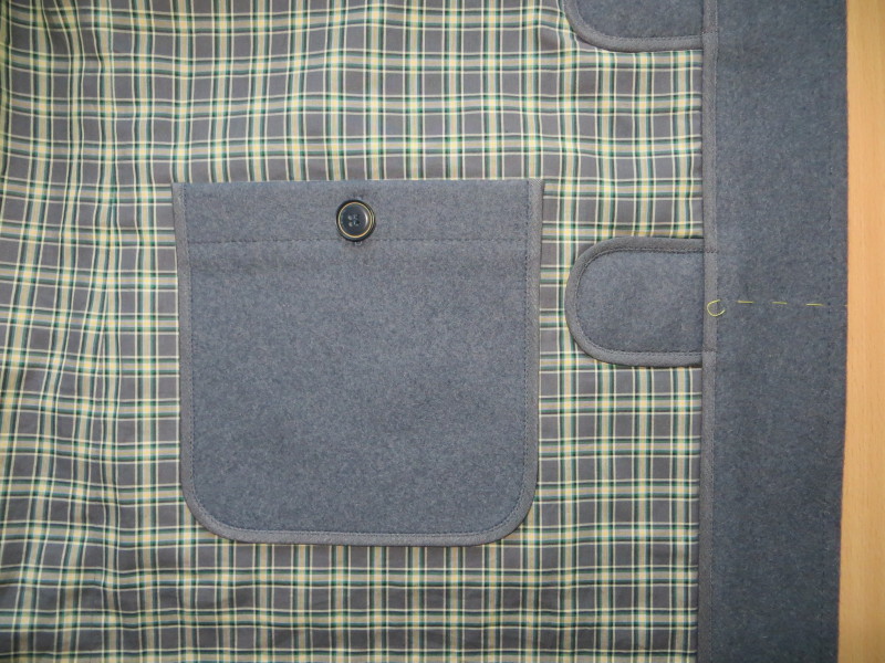 Так и есть - косая бейка из подкладочной ткани, которая шла в комплекте к шинельной (молодцы! позаботились) очень хорошо по цвету подходит). Только я её перевернула матовой изнаночной стороной.