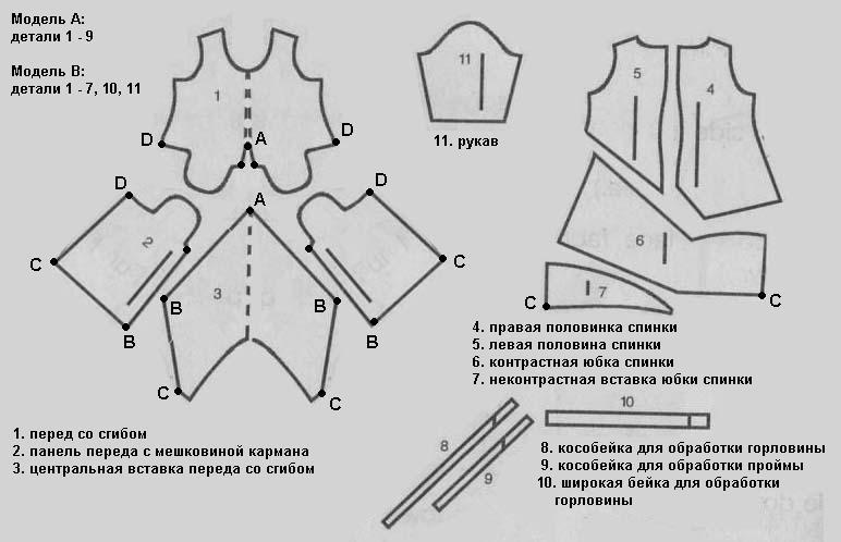 Александринка Опубликовано 15 мая, 2014 Поделиться #740 Опубликовано 15 мая, 2014 Итак, платьице из сообщения 671. На самом деле их два, одно без рукавов и однотонное, другое с рукавами и с тканью-компаньоном. Материал - трикотаж, но по мотивам можно сшить из любого имеющегося в закромах запаса :-)Уменьшенные лекала и раскладка на ткани недостаточно интуитивно понятные, поэтому я немного подвигала картинки туда-сюда, детали со сгибом разложила в симметричную деталь, совместила края, как они будут в сборке, на мой взгляд так оно нагляднее. Спереди получается уже знакомая юбка-коробочка, где карманы и подшитый к мешковинам карманов низ создают неровный контур. Сзади - буль с размоделированными в три детали талиевыми вытачками и заужением низа.Простите, не стала переводить все инструкции, по-моему после схем и так все понятно. Galina O 1 Ссылка на сообщение Поделиться на другие сайты Поделиться