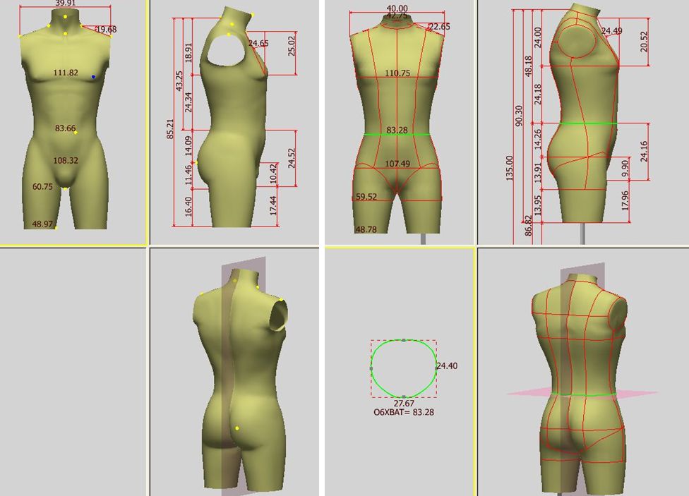 Линию талии ставит сразу на узкое место, линию груди- не поняла как определил. Но выпуклости построил на одежде на месте.