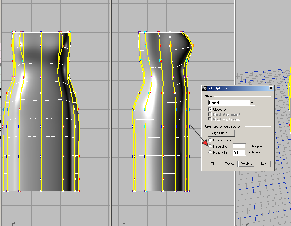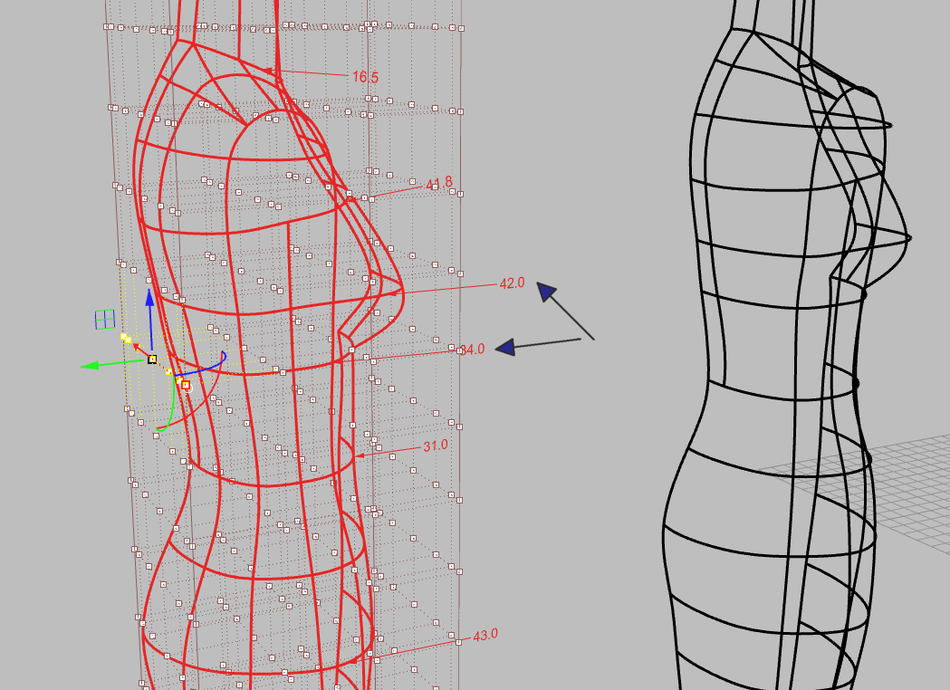 ollya Опубликовано 18 сентября, 2012 Автор Поделиться #34 Опубликовано 18 сентября, 2012 Задалась вопросом, а почему нельзя манекен, созданный в Рино трансформировать CageEdit (Редактирование Клеткой)? Попробовала, поигралась - поверхность остается красивой. Вот примеры Можно.Даже лучше, если нужно просто создать плавную форму.Но точность редактирования теряется. При редактировании одного размера захватываются и соседние.На скринах - редактирование обхвата под грудью(Показала каркас, а не поверхность для наглядности)Можно добиться точности точками каркаса, а потом сгладить где нужно клеткой. А местные неровности потом можно и точками поверхности подправить.(Я так делала, когда в Луке у манекена получались выступы под проймой- возвращалась в Рино и точками поверхности подправляла проблемное место) Ссылка на сообщение Поделиться на другие сайты Поделиться