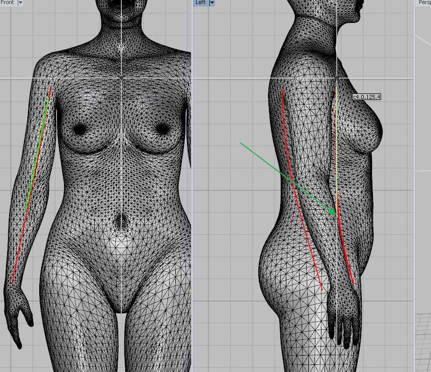 ollya Опубликовано 26 октября, 2013 Автор Поделиться #108 Опубликовано 26 октября, 2013 Поясню картинкой фразу ткань в свободном висящем состоянии не может изогнуться- будет свисать отвесно от нижнего переднего угла до того места , где она пересечется с рукой.Ниже ткань , естественно, пойдет по руке . Изгиб заднего шва зависит от ширины рукава.Для одношовного рукава без локтевой вытачки нет смысла делать изогнутые направляющие. Ссылка на сообщение Поделиться на другие сайты Поделиться