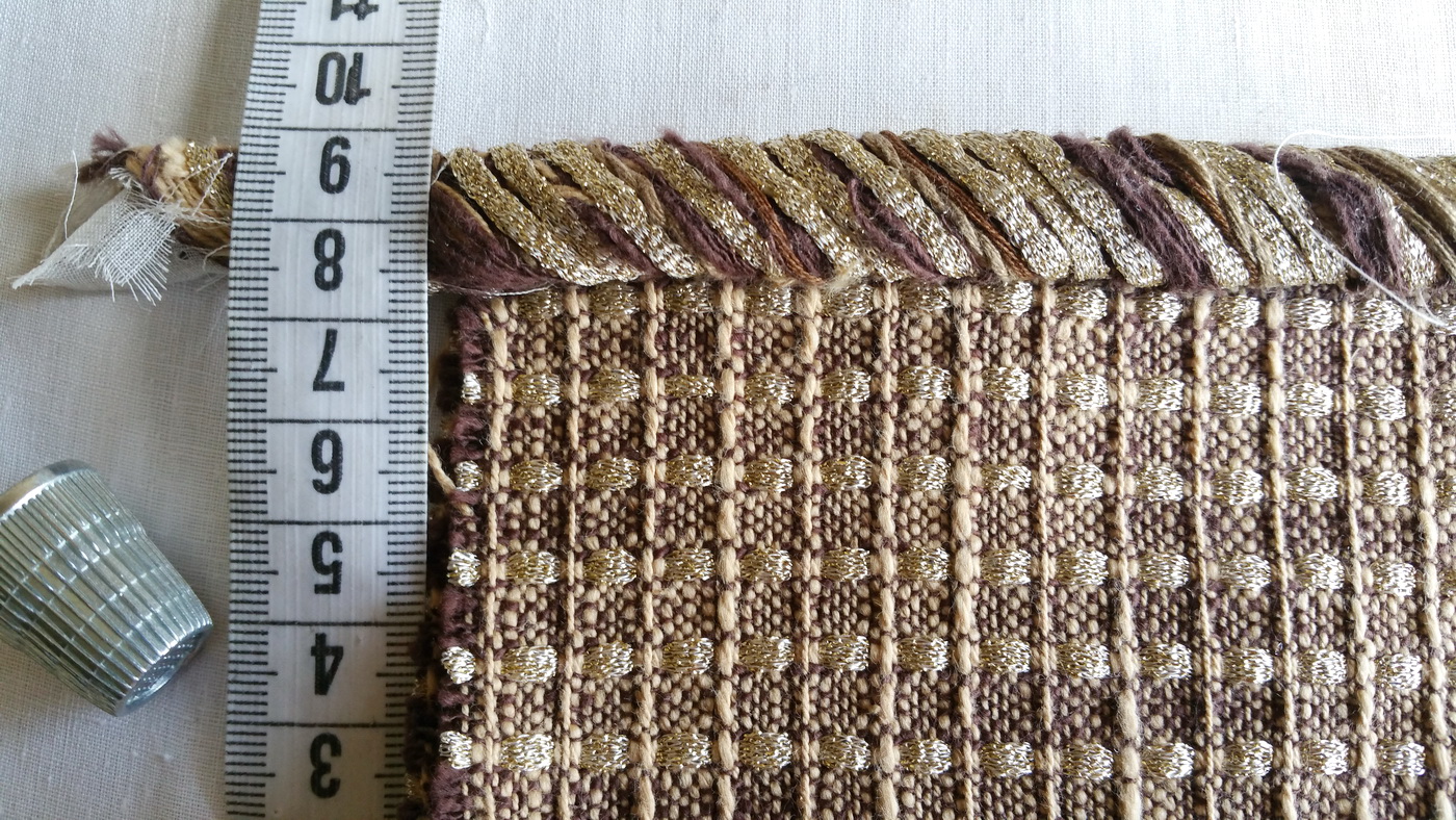(Золота получилось много, можно было не добавлять … возможно, если бы накладывала доп. нити с наклоном, то в готовой тесьме можно было бы избежать чрезмерной параллельности … упущение, что совсем не добавила бежевых нитей из самой ткани)