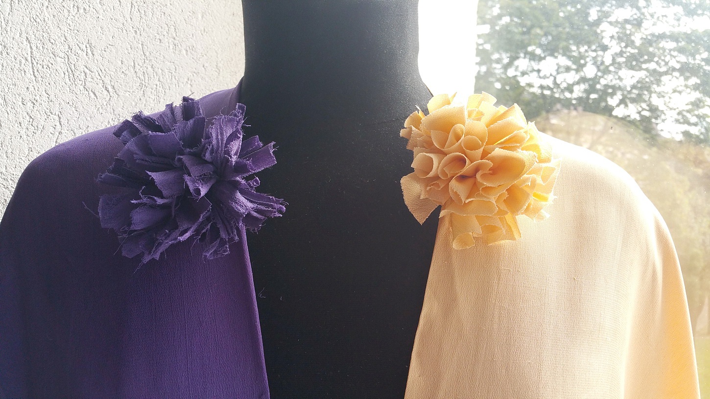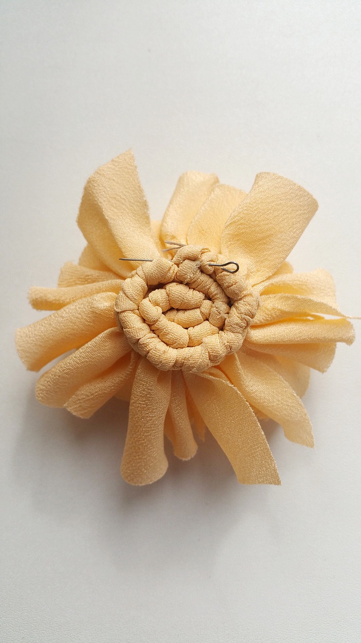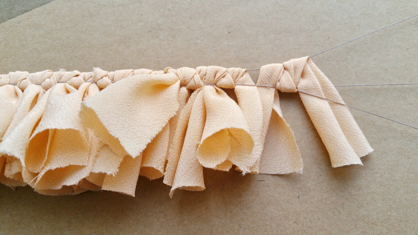 Затем нарезала из крепдешина прямоугольных кусочков, ширина которых позволяет их произвольно (не очень стараясь) сворачивать.