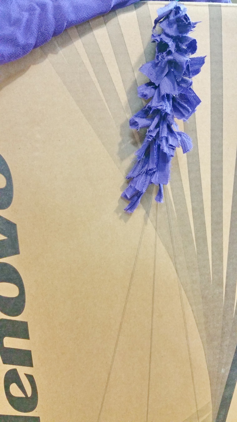 Сейчас разрезала трес и на сутажную основу (по хорошему это должен быть тонкий рулик из основной ткани) привязала простейшим узлом макраме те же самые тряпочки … если бы поутюжила их перед тем как, вышло бы аккуратнее.