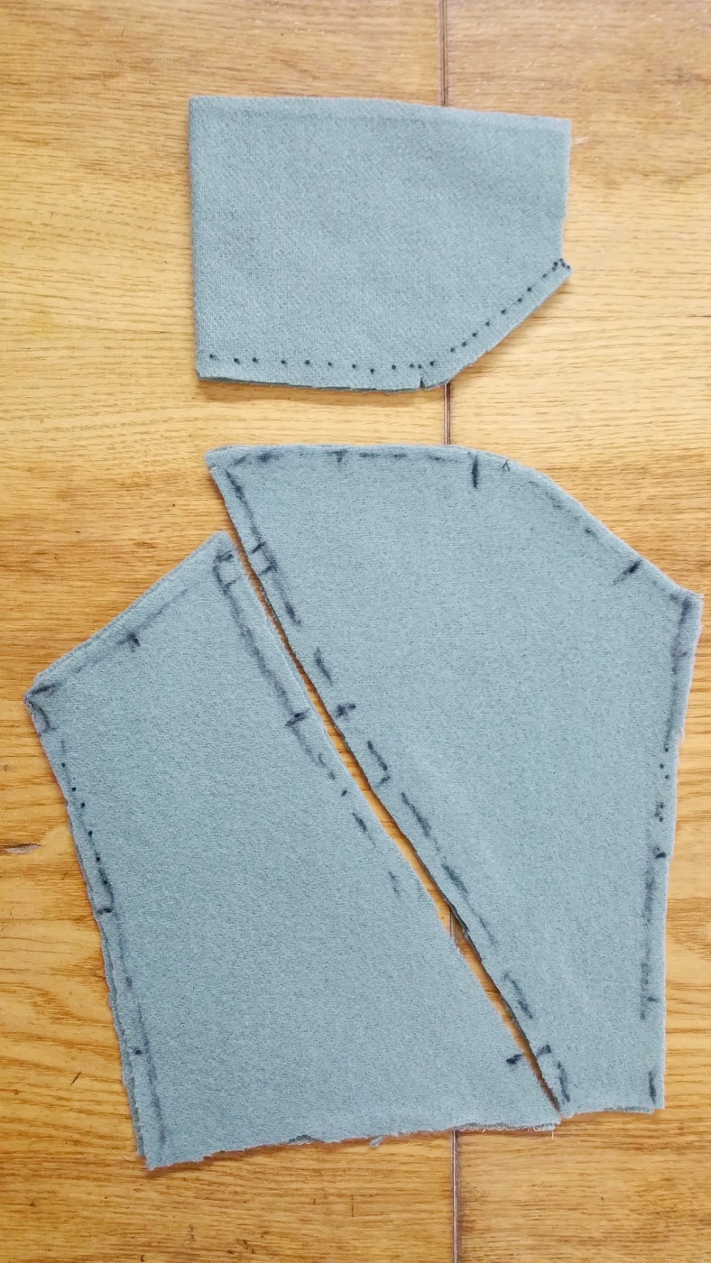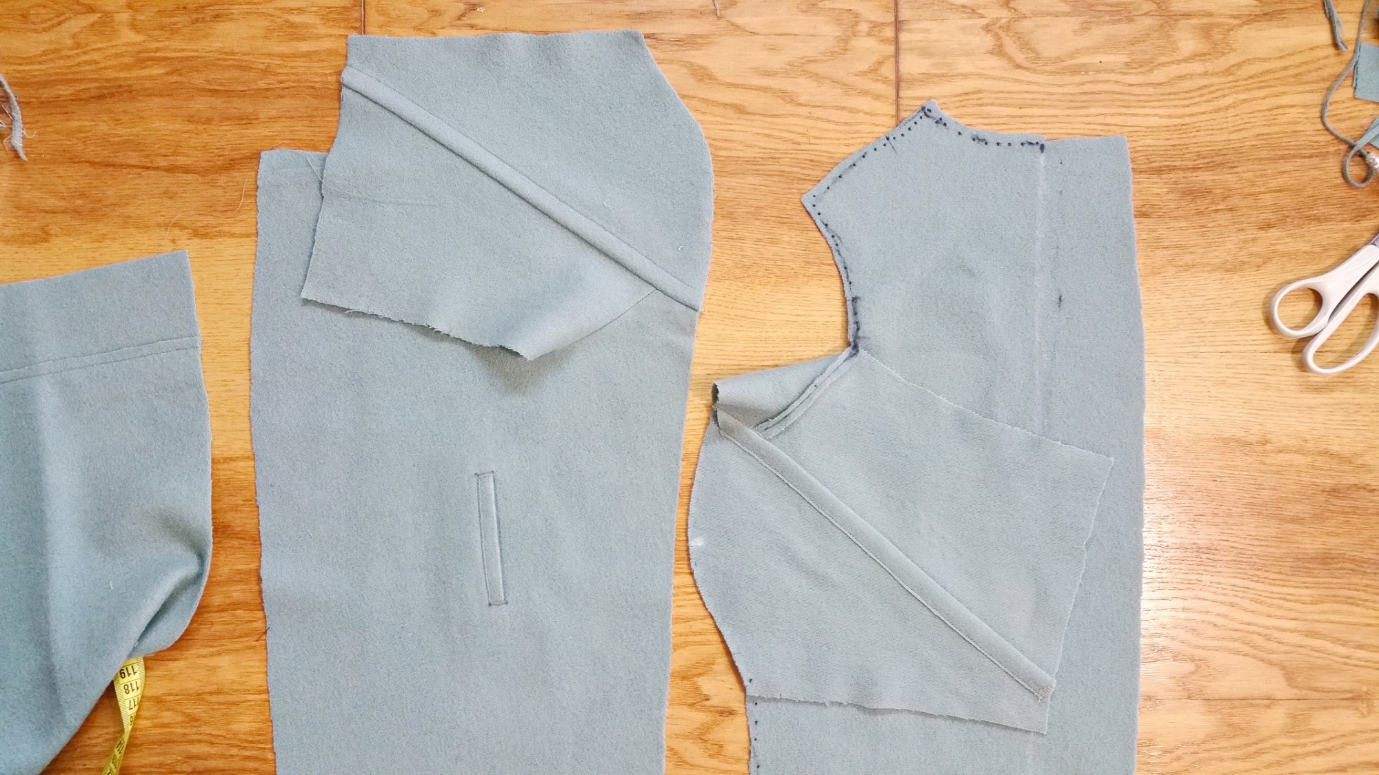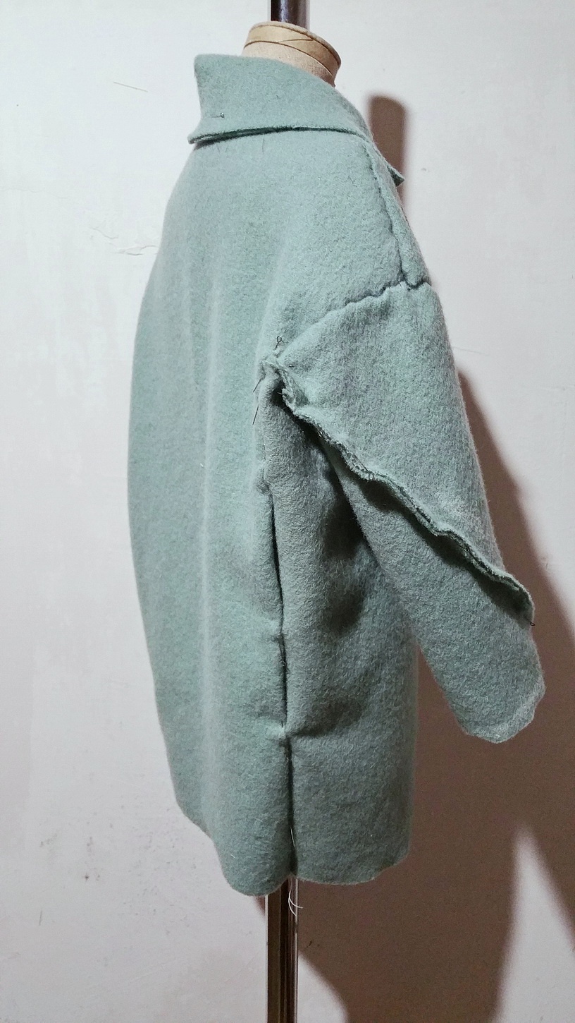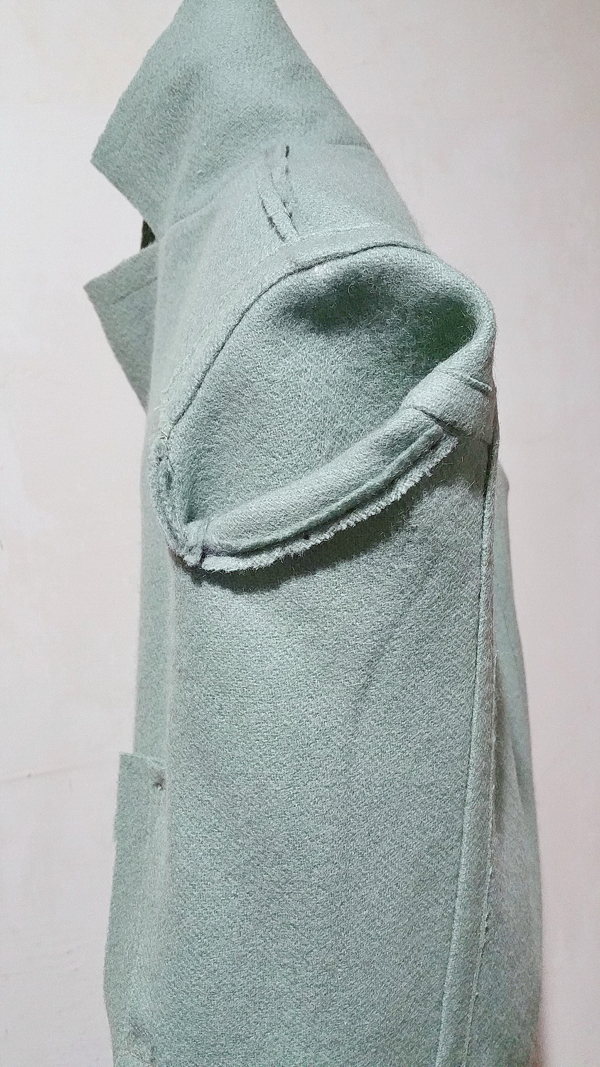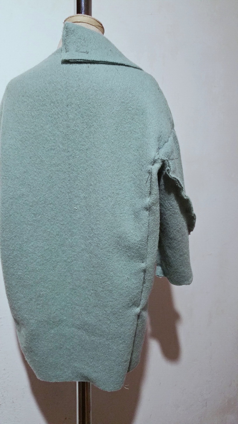 Для макета взяла тонкую пальтовку, которая не очень держит форму … поэтому пройму сильно не понижала (у меня она всего на 5см ниже л. груди, в оригинале она на л. талии и ниже).