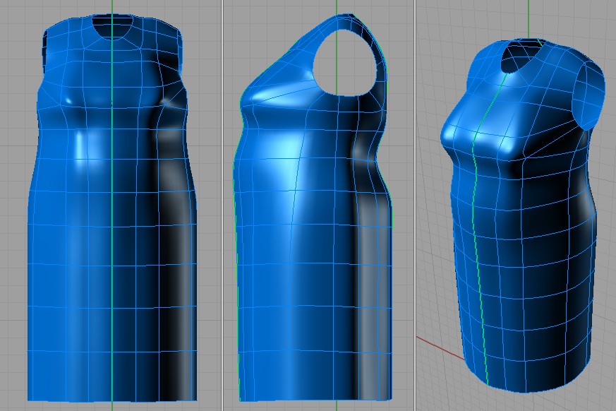 Гаспар Опубликовано 11 января, 2013 Автор Поделиться #253 Опубликовано 11 января, 2013 (изменено) Ещё один вариант т-сплайн манекена, который мне хотелось построить. До увлечения т-сплайнами, я строила циркулярные манекены, в которых использовала вертикальные направляющие, расходящиеся пучком от шеи. Используя этот подход, мне хотелось построить циркулярный т-сплайн -- затянуть тело непрерывным чулком. Меня последнее время привлекает спиральный крой. Так организованный т-сплайн будет непрерывным "бесшовным", что позволит рисовать на нём любые спирали, не заботясь о пересечении швов.Взяла обычный т-сплайн манекен и закрыла на нём проймы Затянула его циркулярно, с использованием ретопоснапа И можно рисовать как угодно Получился конечно не красавец, но это первая попытка. Или вообще надо было порыться в старых файлах и использовать готовый каркас -- так как все фасетки будут четырёхугольные, затягиваться он будет на ура. Но это так, мысли вслух...Циркулярный манекен не обязан быть точным, он планируется использоваться только для разработки линий. Изменено 11 января, 2013 пользователем Гаспар Моя страничка вконтактеМоя группа вконтакте :3Д в создании одежды: в гостях у Бегемота Ссылка на сообщение Поделиться на другие сайты Поделиться