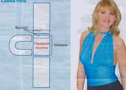 Тина Опубликовано 22 марта, 2007 Поделиться #5 Опубликовано 22 марта, 2007 тоже о топе наподобие:Моя веб-страница---------------------------От Т.В.:Скопирую инфу сюда, с вашего позволения :) Нам понадобятся стрейч-шелк голубые нитки Как делать Все делается сразу на ткани, Чем ткань эластичнее, тем лучше. Нужно выкроить четыре прямоугольника. Для первого ( передней полочки) измерь сантиметром свою талию, раздели пополам и прибавь 4 см – это длина, Высота – измерь от линии под грудью до талии + 5 см. Высота двух других прямоугольников такая же, как у первого, а чтобы определить длину – измерь талию, умножь эту величину на 2,5 см, Например, если твоя талия 70 см: 70*2,5=175 см. Такова длина. Эти два прямоугольника пришей к каждому боку первого ( см. рис.) Когда топ будет готов, эти прямоугольники оборачиваются два раза и завязываются на спине. Измерь полуобхват линии под грудью, прибавь 20 см – это ширина следующего прямоугольника, который идет петлей вокруг шеи, Длину отрегулируй сама, чтобы петля была внатяжку. Пришей как показано на рисунке, делая несколько мелких складок. Ссылка на сообщение Поделиться на другие сайты Поделиться