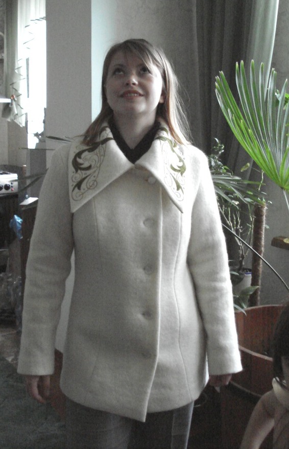 На себе пальто покажу, вот только пояс довышиваю. Подплечников пока нетути, подкадка золотая (атлас как на косых бейках) в тон вышивке, пуговицы будут в тон ткани. В два ряда. Воротник вообще интересный получился, так 3 вида его драпировки, две на фото а одна как под горло. Его я потом покажу. Утеплителя нет, это весенний вариант да и ткань лоден оченно теплая.