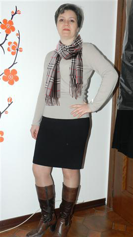 nataglia Опубликовано 25 февраля, 2013 Поделиться #91 Опубликовано 25 февраля, 2013 (изменено) Вот еще комплект, который, как мне кажется, скучный. Свитерок очень удобный,тонкий и теплый. В низу широкая резинка где то на 20см. Не могу придумать с чем одевать. Да и цвет????... Как ? Мне можна такой? По мне - юбка+джемпер - с ЭТИМИ сапогами не одевать:1. сапоги - 2 цвета (если правильно разглядела). В принципе, получается, что в комплекте 3 цвета: черный, серый и коричневый, и вроде как эти цвета представлены в колье, но вот тогда колье нужно более массивное, чтобы коричневый был сильнее представлен. Коричневый выбивается из дуэта "серый-черный", более логично было бы бордо или "testa di moro", но можно и коричневый попробовать. 2. Ноги кажутся короче, потому что 2-х цветные сапоги, потом промежуток телесного цвета, потом черная юбка, серый джемпер.... Фигура слишком разроблена. Можно было бы попробовать черные сапоги с черными колготками и черной юбкой ..... Это как рекомендациях - если носить брюки, заправленные в сапоги, то брюки и сапоги должны быть одного цвета, особенно для невысоких женщин. Исключение - комплект для верховой езды.3. Стиль сапог - по мне - противоречит "верху". Я бы такой джемпер одела с черными узкими брюками ("сигареты") Изменено 25 февраля, 2013 пользователем nataglia Ссылка на сообщение Поделиться на другие сайты Поделиться