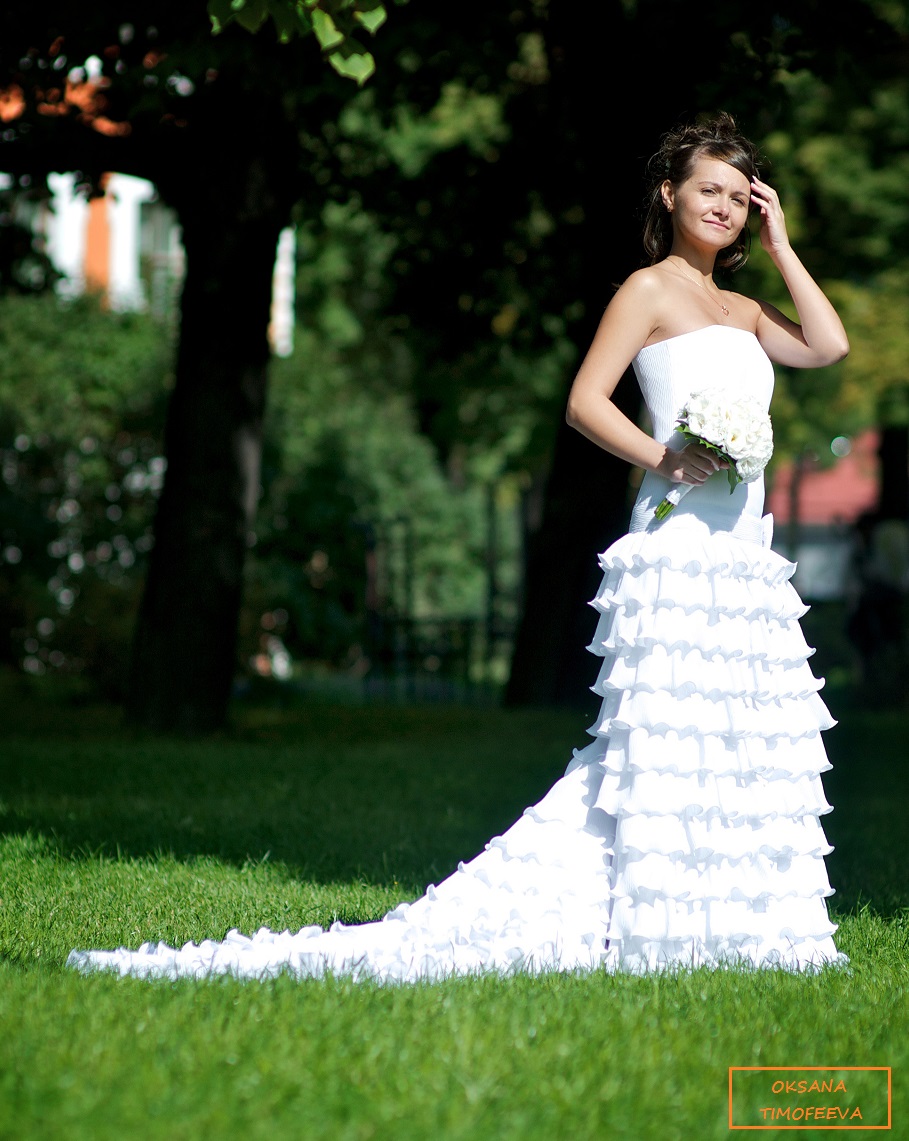 С ума сойти,какое платье.А продевать в шов леску-это просто подвиг. А ткань натуральная?Очень красиво смотрится.Такие нежные воланы.Невеста просто восхитительна!