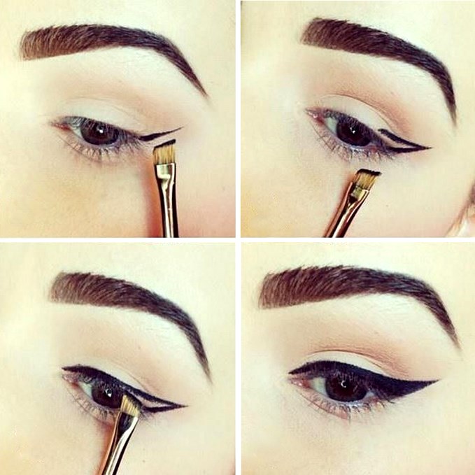 BriNa Опубликовано 8 августа, 2018 Поделиться #462 Опубликовано 8 августа, 2018 Плоская упругая скошенная или прямая кисть отлично поддерживает нетвёрдую руку ) и прокрашивает рельеф.Длина среза у неё получается до 7мм, т.е. сразу отпечатывается прямая линия такой длины, дальше просто смещаем кисть к уголку глаза сначала в одну сторону от условного центра, потом дорисовываем как удобно другую сторону. Примерно так это на практике:Получается и такая стрелка, если потренироваться:Которая справа сделана двумя оттенками теней, ближе к внутреннему уголку тени с блеском и посветлее, это добавляет склере света, а к внешнему краю более темные и матовые, удлиняете глаз.А я больше люблю растушеванные почти до невидимости, без тонкого хвостика: _ Sine ira et studia _ Ссылка на сообщение Поделиться на другие сайты Поделиться