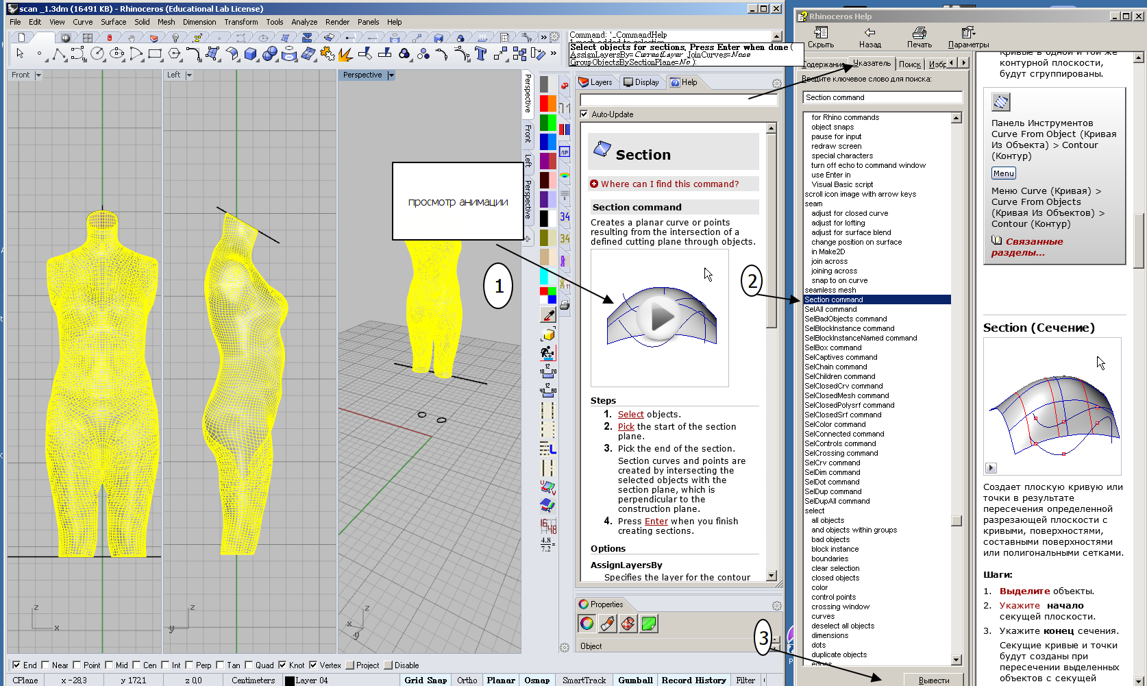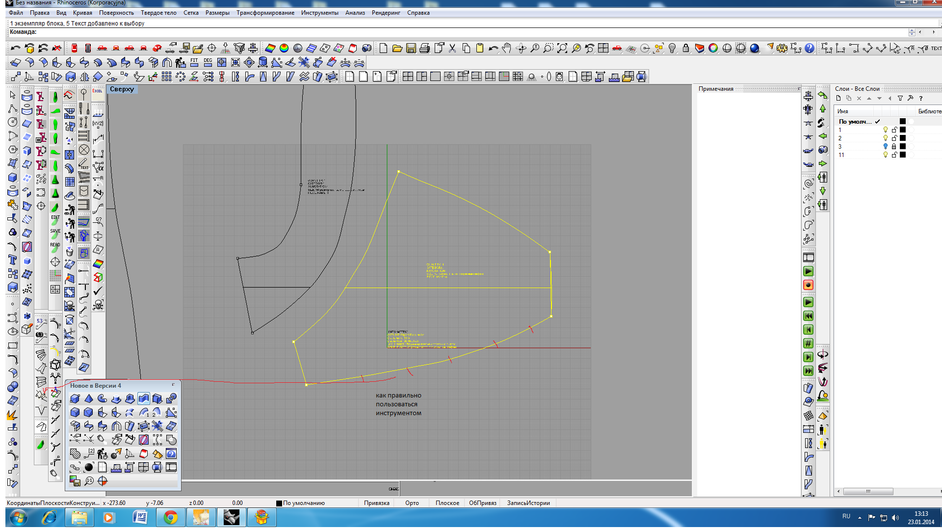 ollya Опубликовано 22 октября, 2013 Поделиться #153 Опубликовано 22 октября, 2013 Если у вас установлена пятая версия Рино - вы не можете пользоваться контекстной русской справкой. Просто возьмите справку на сайте Дмитрия, запишите её в любую папку на вашем компьютере. Можно на рабочий стол положить. Открывать очень просто: дважды кликнуть по файлу левой кнопкой мышки.Один из вариантов- чтобы не открывать- закрывать справку.Открываем справку рядом с окном Рино. В Рино на экране контекстная справка на английском.Как ее найти писала выше http://club.season.ru/index.php?s=&sho...t&p=782890)если непонятно по анимационному ролику и английскому описанию, по указателю находим соответствующую команду в обычной справке в русском варианте(так параллельно и английский можно учить:)) Ссылка на сообщение Поделиться на другие сайты Поделиться